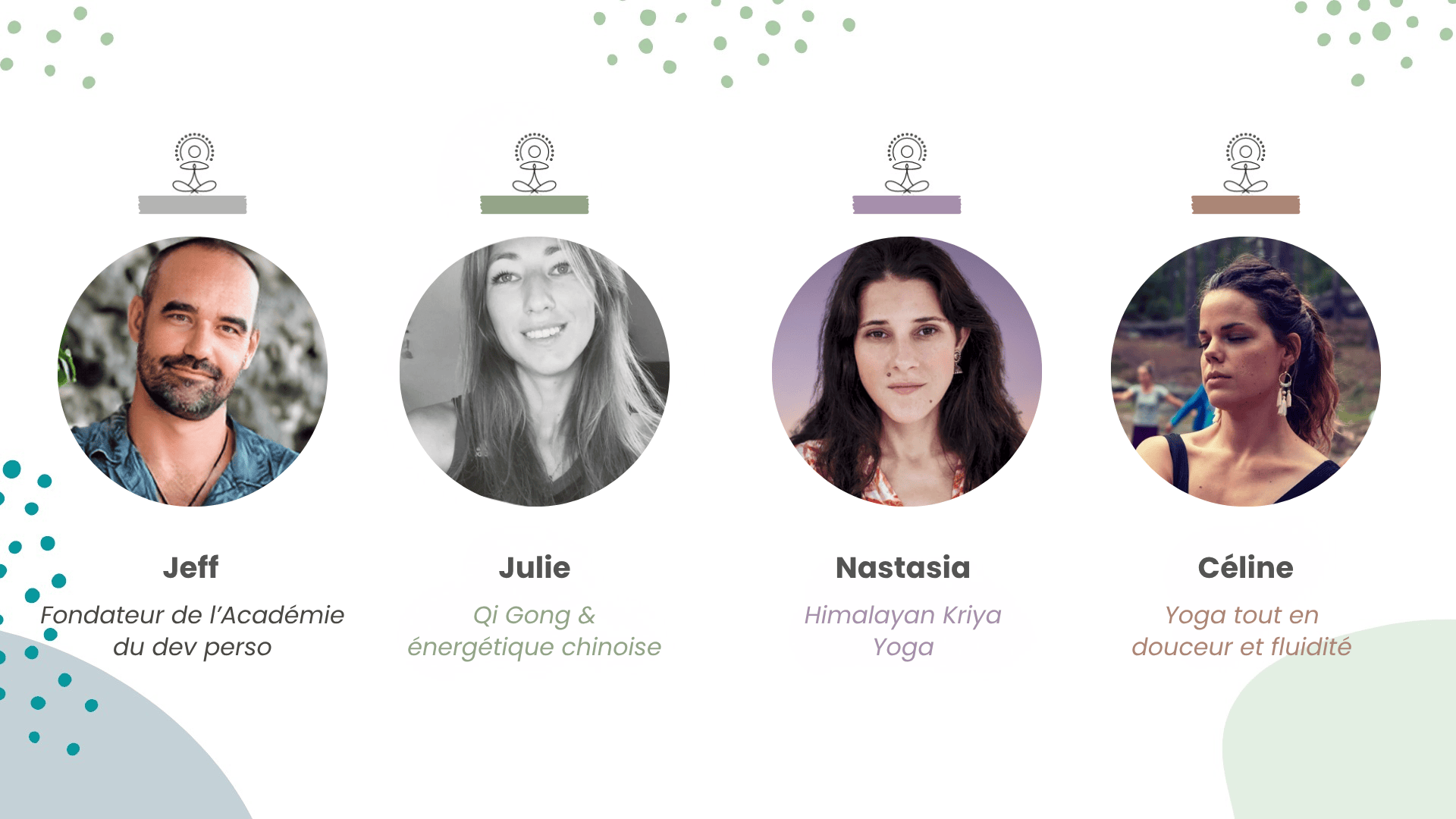 Nous avons réuni une équipe de professionnels dans les pratiques issues des sagesses ancestrales ou modernes : inspiration du Yoga / Tai Chi / Qi Gong / Méditations... (liste non exhaustive et évolutive !)